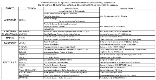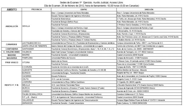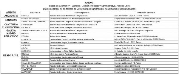 Orden JUS/151/2012, Anexo I. Sedes de Examen y Anexo II Listados de excluidos.